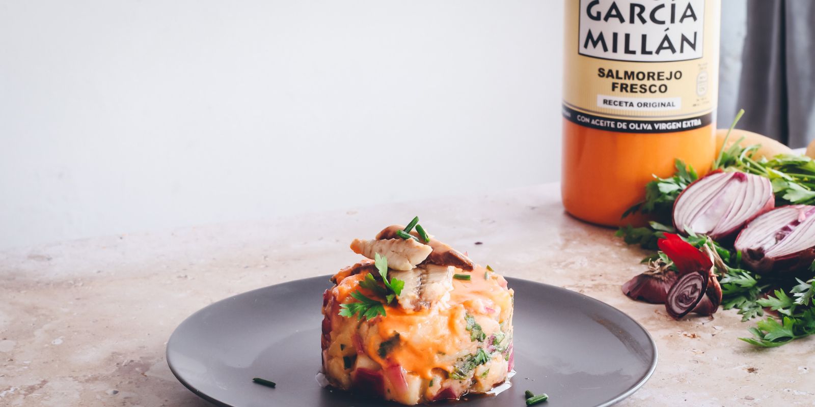 Esta ensalada de patatas aliñada con Salmorejo Original García Millán es muy sencilla: pocos ingredientes, cero complicaciones y un resultado que sorprende en cada bocado. La patata cocida aporta la base reconfortante de toda la vida, la cebolla morada le da un toque crujiente y ligeramente picante, y el salmorejo lo envuelve todo con esa cremosidad intensa a tomate, aceite de oliva y ajo que solo un buen salmorejo sabe dar.